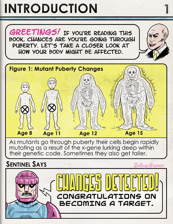 C’est parfois difficile de se rendre compte que son corps change et que l’on est un mutant, c’est pourquoi le professeur Xavier a décidé d’écrire un livre pour rassurer les futurs mutants. Grâce à cet ouvrage vous serez apte à être traumatisé et prêt à être recruté parmi les élèves du professeur le plus chauve de l’histoire et peut–être faire partie d’une des équipes X.
