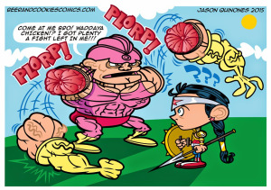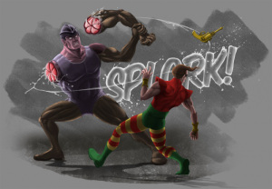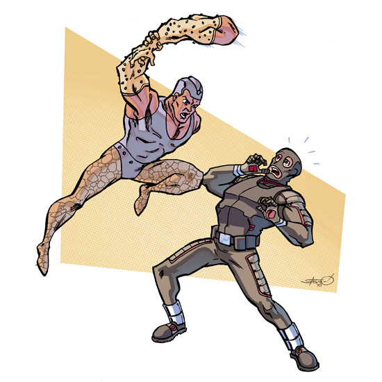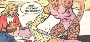 Imaginez que vous voyiez débarquer un type à la peau orange, les bras recouvert d’une peau pustuleuse comme un crapaud, des jambes qui ressemblent à celle de la Chose et si ça ne suffisait pas… un costume rose. Là, si vous êtes un super-vilains, vous imaginez déjà la raclée que vous allez lui infliger… Mais tout bascule quand vous voyez le type courir vers vous l’écume aux lèvres et s’arracher le bras pour vous taper avec!