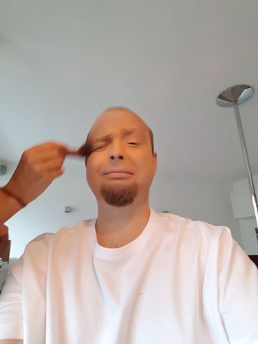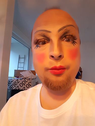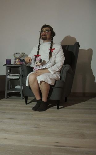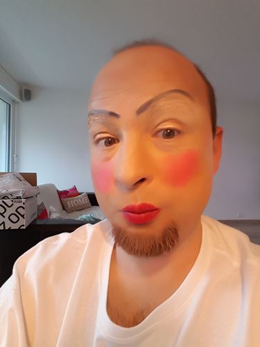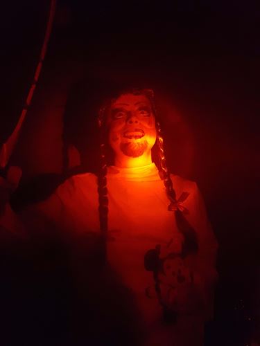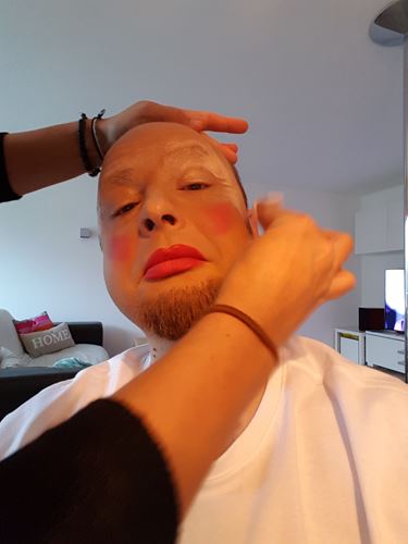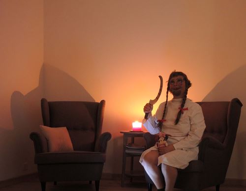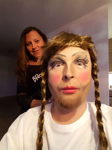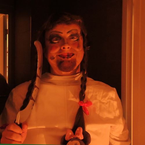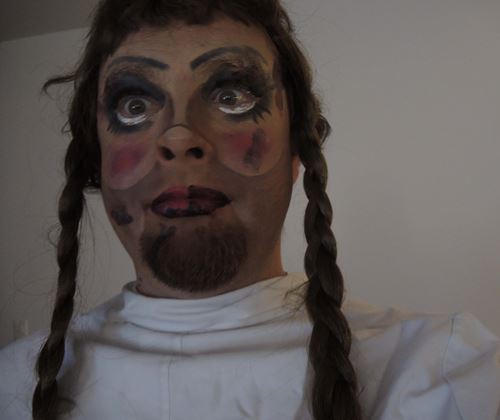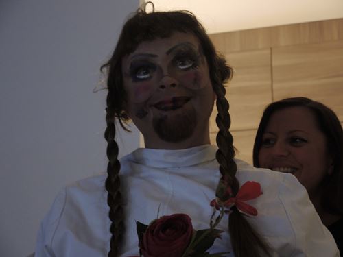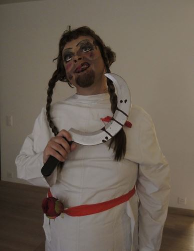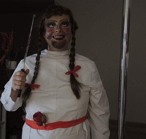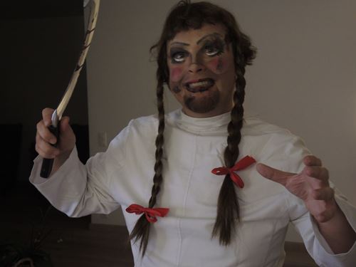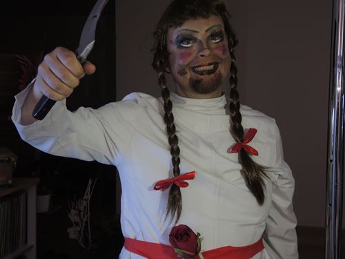 Deuxième round de ce « Mets ta morphose » où Cynthia a voulu me torturer encore une fois à coup de maquillage. Après le Joker, elle a tenu absolument à me travestir, mais attention pas n’importe comment! Elle a décidé de me transformer en Annabelle, la poupée démoniaque du film Conjuring. Autant vous dire que je suis plutôt loin du personnage original: je suis plus large, plus barbu, plus chauve, plus masculin et un poil plus grand quand même.