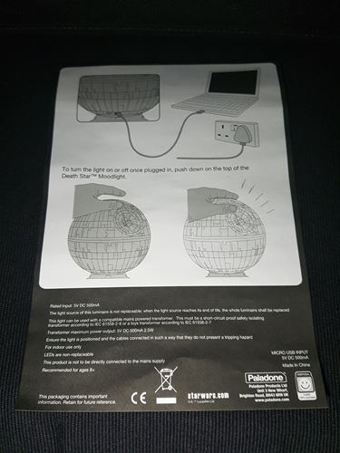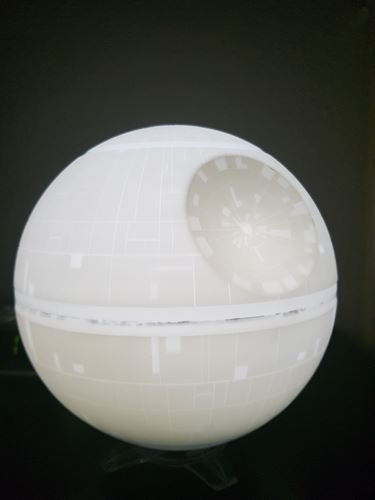 Éteinte elle ne ressemble franchement à rien, on a presque l’impression d’avoir acheté une version cheap de l’Etoile de mort, mais une fois allumée, grâce à une prise mini usb, c’est juste une tuerie.Le gros avantage c’est que ce sont des LED à l’intérieur, donc pas de risque de surchauffe.