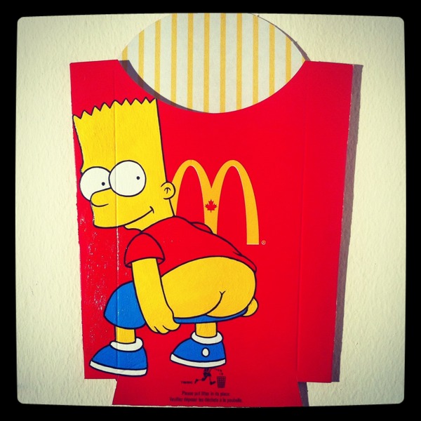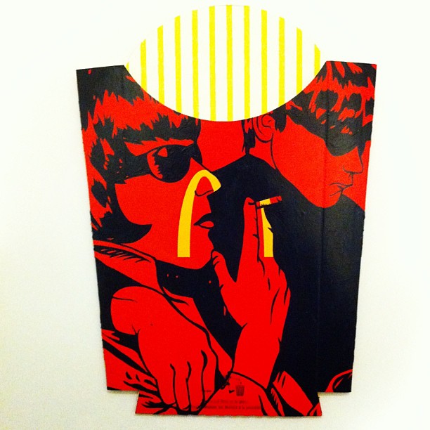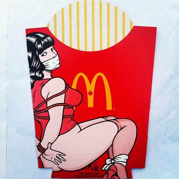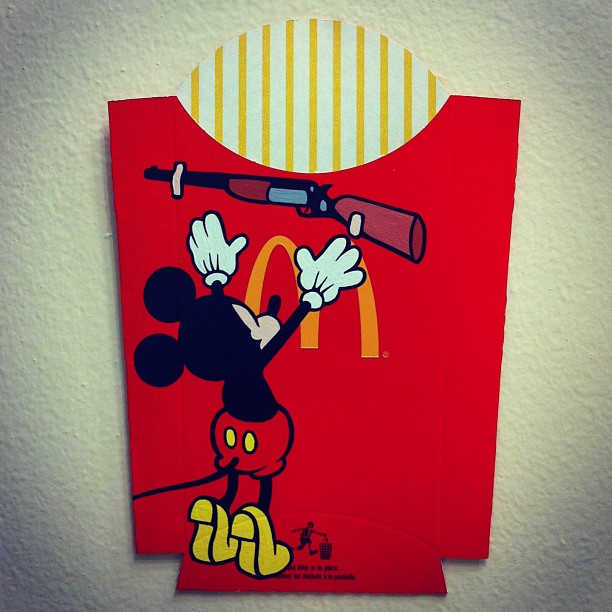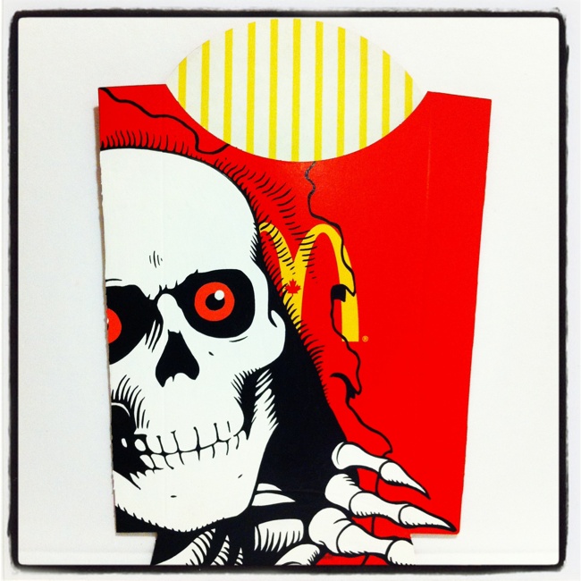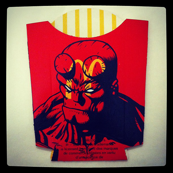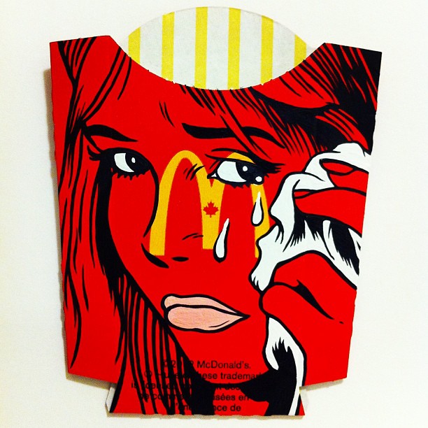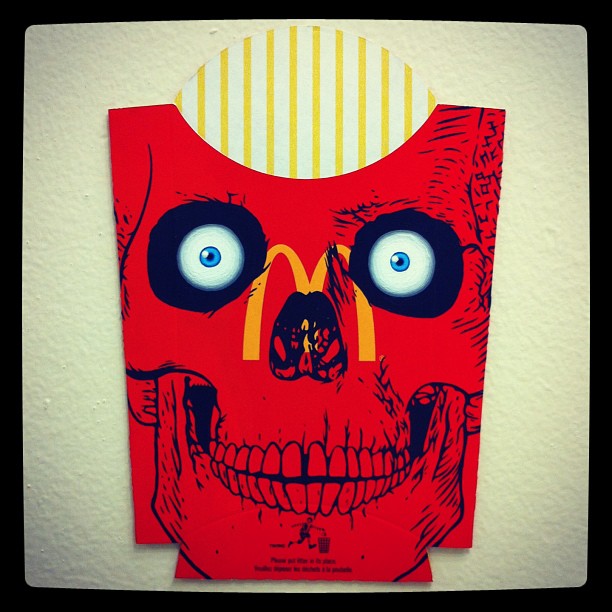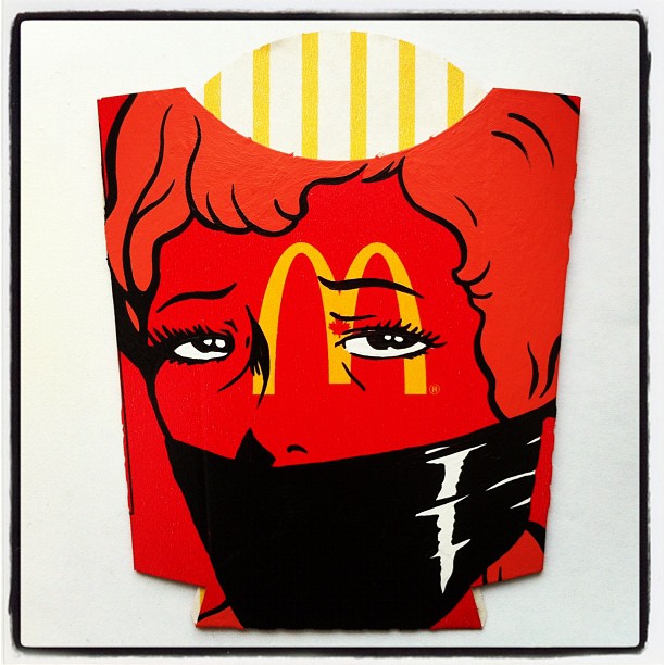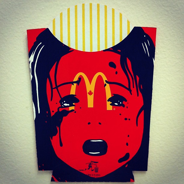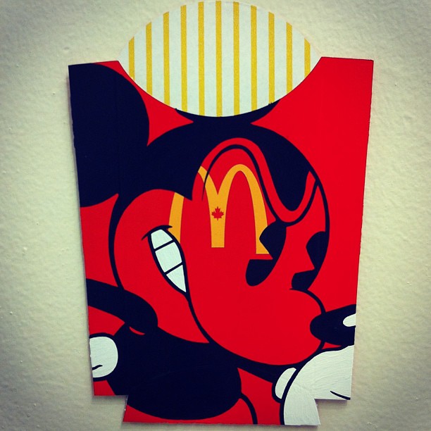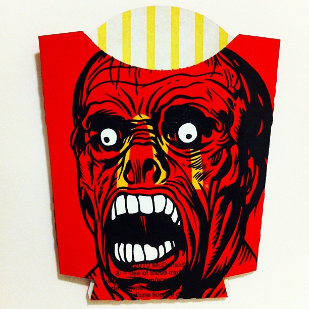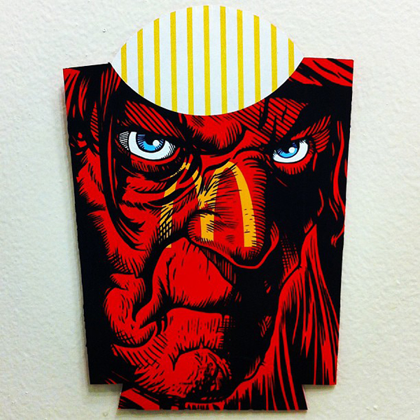 Je voulais vous parler d’une série de peintures qu’il a fait sur les cornets de frites du Macdo et qui sont tout simplement superbes. De simples têtes de morts, qui foutent les boules, à Bart Simpson en passant par Mickey et Batman, tout les sujets sont bons pour être représentés sur ce support rouge.