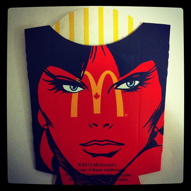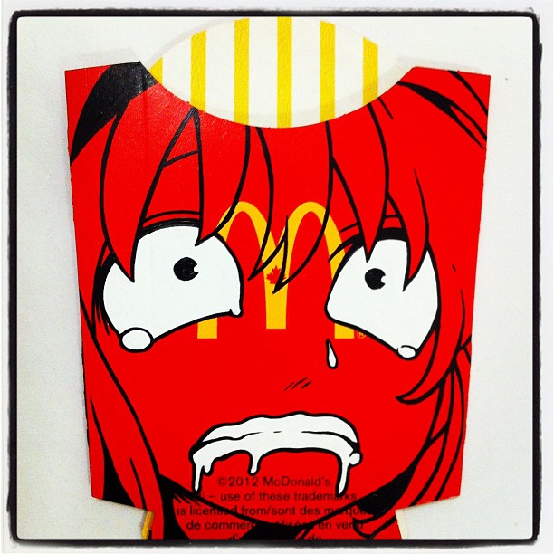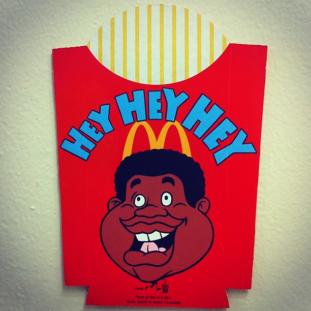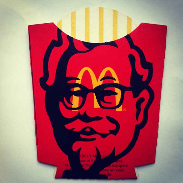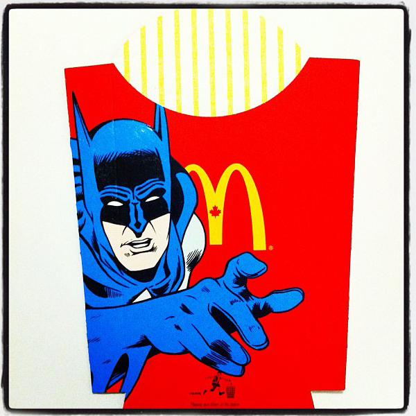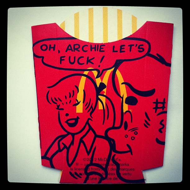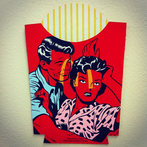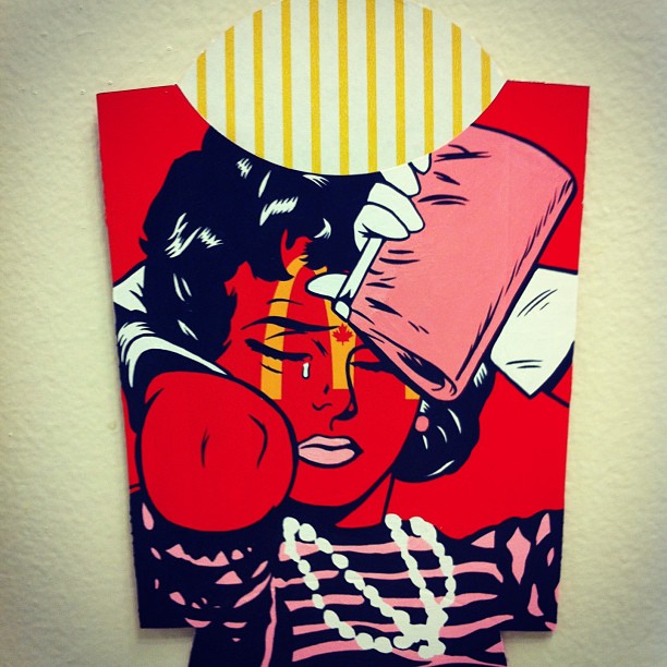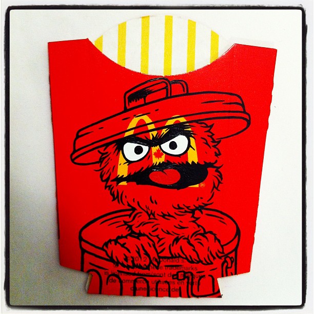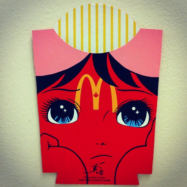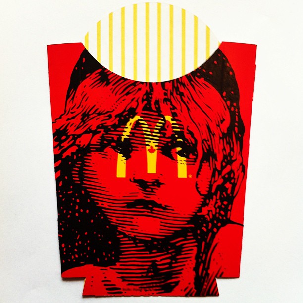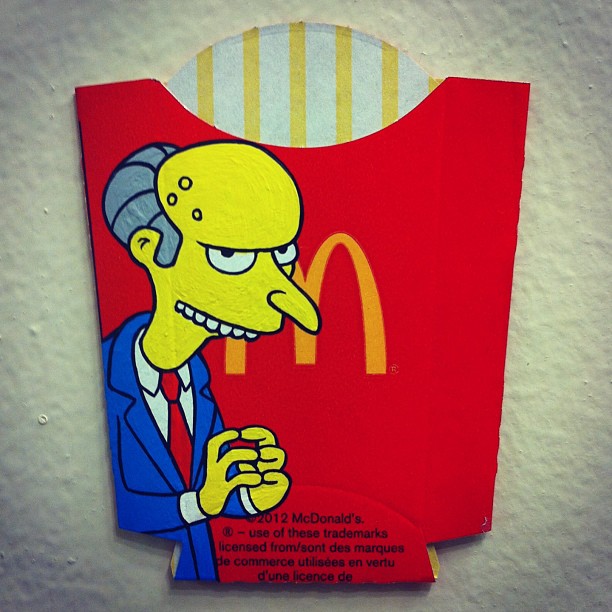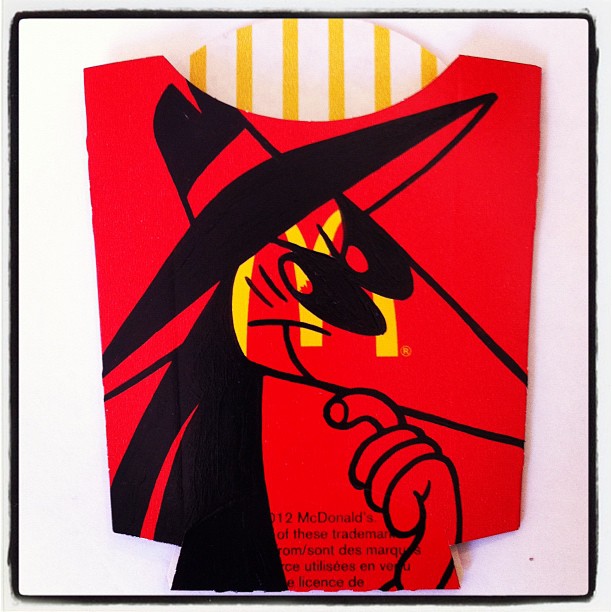 Je voulais vous parler d’une série de peintures qu’il a fait sur les cornets de frites du Macdo et qui sont tout simplement superbes. De simples têtes de morts, qui foutent les boules, à Bart Simpson en passant par Mickey et Batman, tout les sujets sont bons pour être représentés sur ce support rouge.