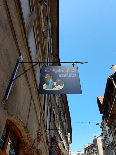 En me baladant il y a quelque temps dans les rues de Genève, je suis tombé sur une enseigne qui m’a tout de suite plu: l’Épée à 2 nains. Intrigué par ce jeu de mot (Vive les nains!), je me suis rapproché pour jeter un œil à la vitrine.